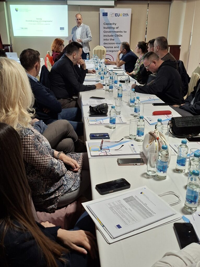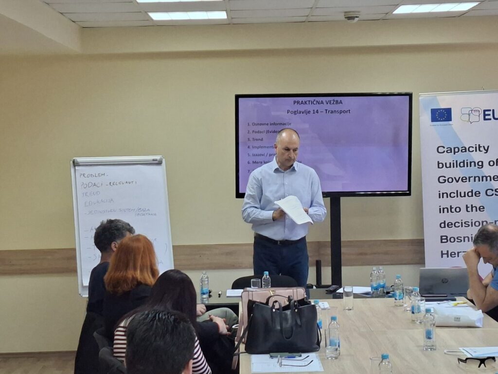 Trener, g-din Vladimir Međak, sa 20+ godina profesionalnog iskustva u vezi sa procesom Evropskih integracija, pregovorima o članstvu i harmonizacijom nacionalne legislative sa EU Acquis, posebno je apostrofirao važnost saradnje civilnog i javnog sektora u procesu EU integracija te mogućnost građenja na pozitivnim iskustvima u vezi sa procesima i korištenim mjerilima iz iskustva Crne Gore, Albanije i Srbije.